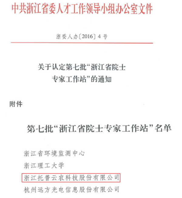 7月25日,中共浙江省委人才工作領(lǐng)導(dǎo)小組辦公室公布了第七批“浙江省院士專家工作站”名單,此次共有22家單位上榜,杭州市2家。浙江省托普云農(nóng)科技股份有限公司(以下簡稱“托普云農(nóng)”)成為浙江農(nóng)業(yè)信息化領(lǐng)域內(nèi)第一家獲此殊榮的企業(yè)。
