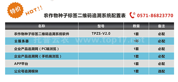 答:您可購買托普農作物種子標簽二維碼系統。包括農作物種子標簽二維碼追溯系統軟件、服務器、企業產品追溯網(手機端、PC端)、APP軟件,還可選配公眾號追溯模塊開發。