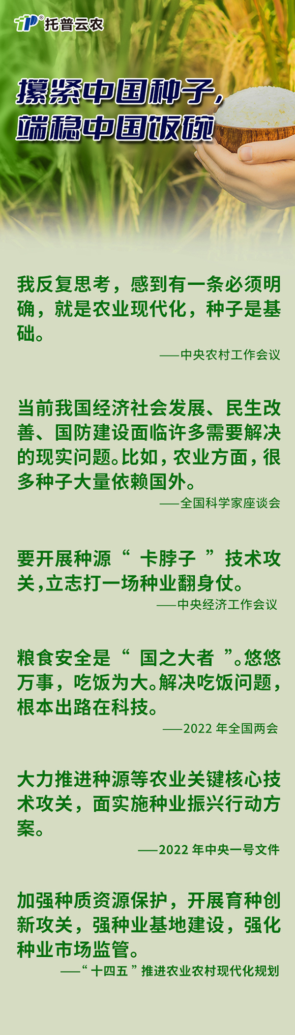 “種子是我國糧食安全的關鍵。只有用自己的手攥緊中國種子,才能端穩中國飯碗,才能實現糧食安全!边@不是中央第一次提到種業發展問題,從中央農村工作會議到“十四五”農業農村現代化發展規劃多次提出要把“種業發展”放到事關發展全局和國家安全的戰略大事上。