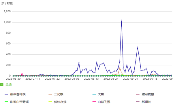 今年8月末,受臺風“軒嵐諾”影響,杭州市余杭區(qū)出現(xiàn)持續(xù)大風和高濕天氣,托普云農智能蟲情測報燈有效監(jiān)測到稻縱卷葉螟及二化螟蛾峰。