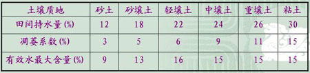 土壤水分是土壤中含有的水分,是農作物水分的主要來源,是土壤的主要組成成分,同時也是水循環的重要環節。土壤水可以分為吸附水、毛管水和重力水。當土壤中的水分能被植物吸收時,被稱為有效水;不被植物吸收時,被稱為無效水。有效水是介于田間持水量和凋萎系數之間的一個值。具體見下表。