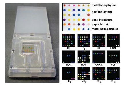 科學家們在玻璃,紙片或塑料片上使用色素打印出6x6的色素陣列,然后再用特制的平板掃描儀或數碼相機對這些陣列進行拍照,并將陣列的初始圖像與放入有毒環境后的圖像進行對比,便可測出該環境是否具有化學毒性。而且這種色素不會受到環境濕度的影響。這項開發工程是由國家健康部贊助的。