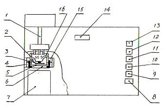1.7 按動(dòng)和面鍵(12)和洗滌鍵(11),托架(4)帶動(dòng)洗滌杯(2)下降,洗滌鉤轉(zhuǎn)動(dòng),開(kāi)始和面顯示器(14)后二位顯示和面的時(shí)間(S)。當(dāng)和面到達(dá)所設(shè)置的時(shí)間(20S)后,托架帶動(dòng)洗滌杯上升,水泵向洗滌杯內(nèi)供水,開(kāi)始洗滌面團(tuán),顯示器前一位顯示洗滌面團(tuán)的時(shí)間(min),當(dāng)洗滌到達(dá)所設(shè)置的時(shí)間(5min)后,儀器停止工作,完成洗滌。和面鍵(12)和洗滌鍵(12)也可分開(kāi)使用,如和面結(jié)束后再按洗滌鍵,儀器開(kāi)始洗滌。