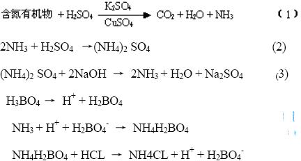 含氮有機(jī)物與濃硫酸共熱,被氧化成二氧化碳和水,而氮則轉(zhuǎn)變成氨,氮進(jìn)一步與硫酸作用生成硫酸銨。由大分子分解成小分子的過程通常稱為”消化”。為了加速消化,通常需要加入硫酸鉀或硫酸鈉以提高消化液的沸點(diǎn)(290℃→400℃),加入硫酸銅作為催化劑,過氧化氫作為氧化劑,以促進(jìn)反應(yīng)的進(jìn)行。