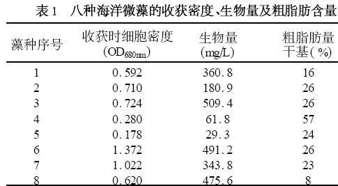 此實驗微藻收獲密度、生物量和粗脂肪含量如表1。綠藻門收獲密度最高,其中小球藻收獲OD6801. 372 ,生物量為491. 2mgPL ,粗脂肪為干重的26 %;而金藻門收獲密度最低,生物量為61. 8mgPL ,但是粗脂肪含量最高為干重的57 %;硅藻門3 株微藻收獲密度分別為0. 592 ,0. 710 ,0. 724 ,其中3 號藻具有最大的生物量為509. 4mgPL ,粗脂肪含量占干重的26 %; 紅藻門的紫球藻個體較大, 其生物量為475. 6mgPL ,粗脂肪僅占干重的5 %。