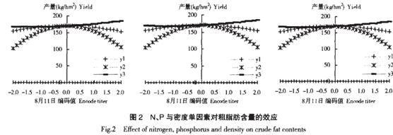 由一次項和二次項的偏回歸系數和t 值(表5)可知, N、P 與種植密度單因子對粗脂肪含量的影響關系在8 月11 日收獲為P(X2)>N(X1)> 密度(X3); 8 月26 日收獲為P(X2)> 密度(X3)>N(X1); 9 月12 日收獲為密度(X3)>N(X1)>P(X2)。兩因子交互效應, 8 月11 日收獲為NP>N 密度>P 密度; 8 月26 日收獲為NP>N 密度>P 密度; 9 月12 日收獲為N 密度>NP>P 密度。
