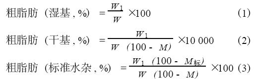 粗脂肪濕基含量、干基含量和標準水雜含量分別按公式(1) 、(2) 和(3) 計算: