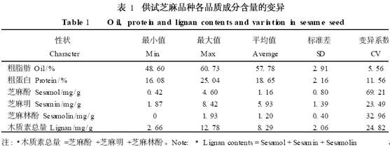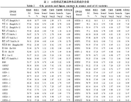 供試材料48份,其中13份為育成品種, 35 份為高代品系,供試樣品來源于2003年本所農場芝麻試驗田(武昌)繁殖收獲的種子。測定項目包括粗脂肪、粗蛋白、芝麻明、芝麻酚和芝麻林酚。粗脂肪測定采用行業標準NY/T4 - 1982;粗蛋白質測定采用國家標準GB /T 14489. 2 - 1993,換算系數5. 30;木質素測定采用高效液相色譜法(HPLC) 。同時采用儀器進行直接測定,相互間可以作比較,儀器推薦為粗脂肪測定儀、SZF-06A脂肪測定儀、SZF-06B脂肪測定儀,這三款儀器中任選一款,都是能夠對脂肪進行測定的。
