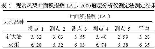 2. 1 LA I - 2000冠層分析儀測定法的測定結果采用LA I - 2000冠層分析儀測定所得觀賞鳳梨品種“新大陸”和“火炬”的葉面積指數結果見表1。