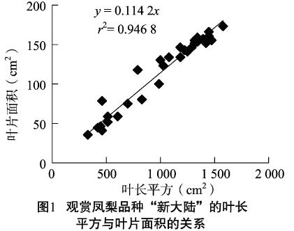 1. 3. 3 回歸方程測定法原理 觀賞鳳梨的葉片呈劍形,為有規則的幾何形狀。其葉片面積與葉片長度之間存在著顯著正相關關系,并且對于特定品種,其葉片面積與長度之間的相關關系應該是固定不變的。因此以葉長的平方作為自變量,以單葉面積作為應變量,建立特定品種的回歸方程后,即可根據葉片長度,運用此方程計算單株葉面積,再結合種植密度,得到葉面積指數。回歸方程的獲得需要葉長和單葉面積的數據進行回歸分析,本研究中,隨機選擇了不同植株上的30片不同大小、不同年齡的觀賞鳳梨葉片,先測量其葉長,然后通過葉形紙稱重法得其單葉面積。葉形紙稱重法利用以下公式計算葉片的葉面積:葉片面積= (1張白紙面積×葉形紙重) /1張白紙重。葉形紙稱重法是一種比較準確但耗時耗力的方法,實際應用不多。本研究之所以選用這種方法,是為了便于與LA I - 2000冠層分析儀法和L I- 3000葉面積儀法所得到的葉面積指數進行比較。