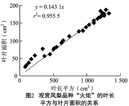 2. 3. 1 回歸方程的獲得 由圖1和圖2可知,“新大陸”和“火炬”2個觀賞鳳梨品種葉長的平方與葉片面積都存在著顯著的線性相關關系。“新大陸”品種,由葉長計算葉片面積的公式為:葉面積(LA)= 0. 114 2 ×葉長平方(L2 ) , r2 = 0. 946 8;“火炬”品種,由葉長計算葉片面積的公式為:葉面積(LA) =0. 143 1 ×葉長平方(L2 ) , r2 = 0. 955 5。