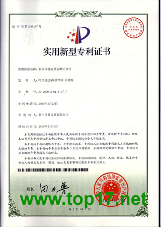您現(xiàn)在的位置:中國農業(yè)儀器網 > 托普風采 >浙江托普農業(yè)環(huán)境記錄儀獲實用新型專利和軟件著作權