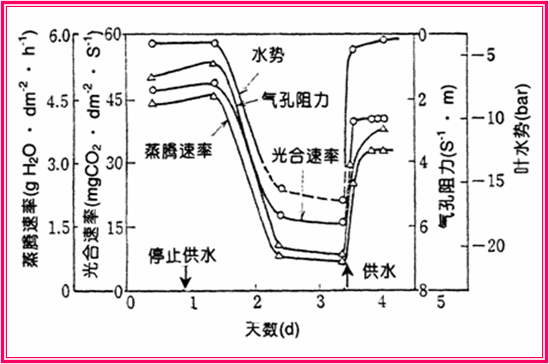當土壤水分不足,蒸發(fā)作用過于旺盛:無法將作物所需的元素正常的運輸?shù)街参镄枰牡胤剑热缬坠约坝酌纾侵参锊荒苷5纳L。同時水分不足還影響著植物的有機物質(zhì)即光合作用的正常進行。水分虧缺會使光合速率下降。在水分輕度虧缺時,供水后尚能使光合能力恢復,倘若水分虧缺嚴重,供水后葉片水勢雖可恢復至原來水平,但光合速率卻難以恢復至原有程度,下圖就是土壤水分缺損以及修復水分過程中,植物光合作用以及其他的一些生理反應的過程: