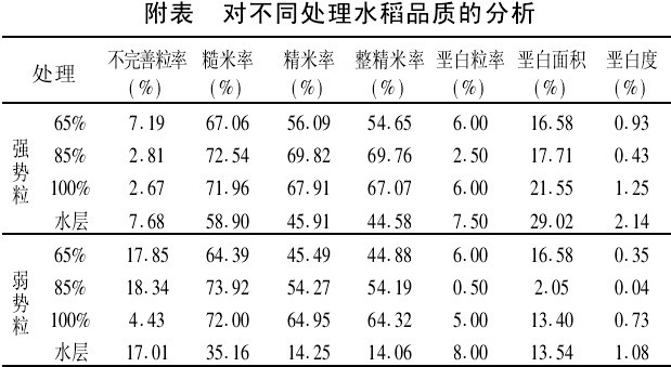 從上表可以看出85%處理的水稻品質明顯高于其他處理,強勢粒在加工品質如糙米率、精米率和整精米率等方面明顯高于其他處理,在外觀品質方面(堊白度)也同樣優(yōu)于其它處理。而弱勢粒除不完善粒率外,也同樣優(yōu)于其他處理。在水稻的齊穗期以及生育期使用溫濕度監(jiān)測儀來進行控制土壤的含水量是比較的合理的,這樣既不浪費水資源同時又能增加水稻的產(chǎn)量以及品質。