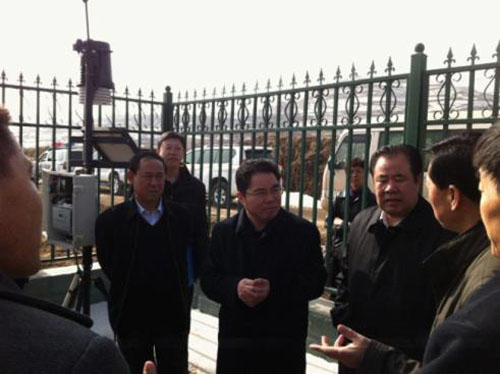 圖為:各參會(huì)領(lǐng)導(dǎo)討論托普儀器土壤墑情監(jiān)測(cè)系統(tǒng)運(yùn)行狀況