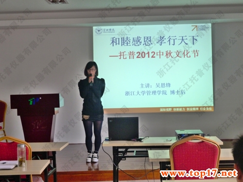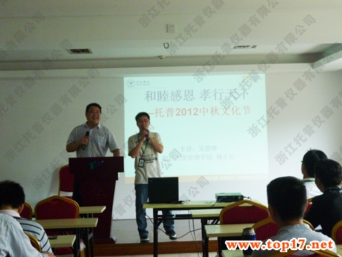 2012年9月22日,在中秋佳節來臨之際,浙江托普儀器有限公司在公司內部舉辦了一場2012年中秋文化節活動。活動圍繞“和睦感恩,孝行天下”的主題開展,并邀請浙江大學管理學院吳恩峰博士前來培訓講解。