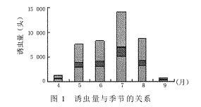 1.2.3 試驗時間 從4月底開始,到9月中旬結束,每天19時至翌日6時開燈。定人定時隔日對誘蟲情況進行統計記載。