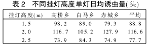 根據3點3組統計顯示(表2),頻振式殺蟲燈1.5 m高度單燈日均誘蟲量為88.8頭,2m高度單燈日均誘蟲量為116.6頭,2.5 m高度單燈日均誘蟲量為77.7頭,掛燈高度以2 m為最佳。