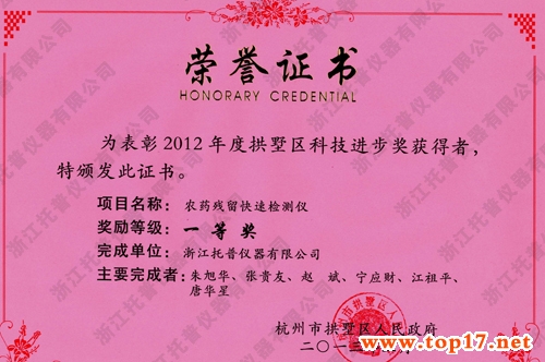 2012年度拱墅區(qū)科學(xué)技術(shù)進(jìn)步獎(jiǎng)通過企業(yè)申報(bào),有關(guān)部門推薦,并經(jīng)專家評審,托普儀器農(nóng)藥殘留快速檢測儀項(xiàng)目最終獲得2012年度拱墅區(qū)科技進(jìn)步獎(jiǎng)一等獎(jiǎng)。