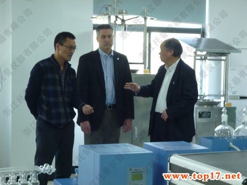 圖為:加拿大泰克資源安德魯·格林教授、國際鋅協會樊明憲教授參觀托普儀器產品