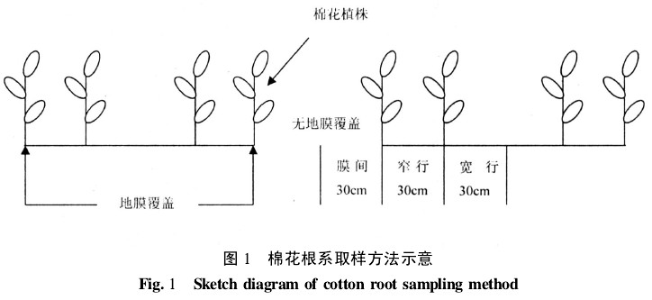 1.2.1 取樣方法在棉花花鈴期(90 d)采用挖掘法取樣。取樣方法:選擇兩行棉花長勢均勻,無缺苗、無大小苗地段(長度50 cm)作為取樣點。根系水平取樣方法:以地膜外側棉花播種行作為起點,分膜間、窄行和寬行,按30 cm相同寬度在水平方向取樣;根系垂直方向取樣方法:在膜間、窄行、寬行三個水平方向,每10 cm一個深度挖取根樣,一直到1 m。取出的土壤和根樣過1 mm土壤篩,撿出活根系。觀察并記錄與地膜接觸表面根系的變態(生長方向的變化,形態的變化,它可以直觀的說明地膜對根系生長的影響)。部分微細根系連同土壤一起收集。將收集到的根系帶回實驗室,在細紗布上反復沖洗,得到的根系樣品,人工用鑷子仔細定位排放到玻璃板上,供掃描用。掃描后的根系重新收集起來,放入烘箱在70e烘干36h ,稱重并記錄。同時將取樣部位的棉花地上部分全部采集帶回實驗室,按不同組織,分別烘干稱重并記錄。圖11.2.2 根系掃描和分析將排放好樣根的玻璃板放在EPSON PERFECTION 4870 PHOTO掃描儀上,在300 dpi象素下,掃描成黑白TIF圖像文件。掃描好的TIF圖像文件用WinRHIZO Basic 2004年根系分析系統軟件計算根系表面積和根長密度等形態特征指標。