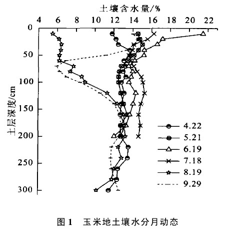 根據實測資料,繪制出試驗年份玉米生長階段土壤濕度剖面變化進程。圖1中的6條土壤濕度曲線,代表不同月份的6次測定。可以看出,除)5cm深的土壤水分由于受地表干濕影響較大,變化多樣,5)16cm土層之間的6條土壤含水量曲線可大致分為3組,4,5月份居中,6,7月份在右,8,9月份在左。這表明試驗年份玉米在生長初期,土壤含水量較低;但是隨著雨季的來臨,其土壤含水量開始上升;而在作物生長后期,由于雨水的稀少以及持續強烈的耗水作用使土壤水分含量降到年內的最低值。16cm以下不同時間土壤濕度線大致接近,這也表明該年度玉米地由式(1)計算$W時,所取深度可小于3m,譬如說2m。