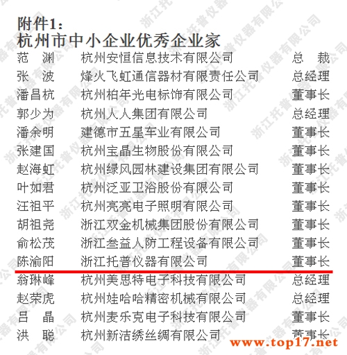 恭喜托普儀器陳渝陽董事長獲得杭州市“中小企業(yè)優(yōu)秀企業(yè)家”稱號