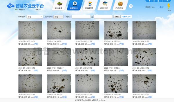 該智能病蟲害監測系統可自動完成蟲情信息、病菌孢子、農林氣象信息的圖像及數據采集,并自動上傳至云服務器;遠程無線傳輸、實時顯示、存儲蟲情、病菌孢子圖像;通過圖像信息庫及技術分析功能,分析田間的病蟲害數量變化,預測病蟲害的發生時間和趨勢;用戶可通過云平臺或手機APP實時查看數據,遠程管理設備,實現信息化管理,達到省、市、縣、鄉各級信息采集站無線傳輸,運程控制,信息數據共享,從而提高相關部門的病蟲害監測防控能力。