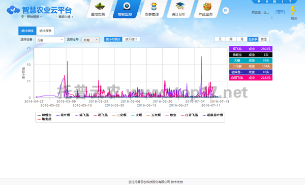 系統通過搭建在田間的智能蟲情監測設備,可以無公害誘捕殺蟲,綠色環保,同時利用GPRS/3G移動無線網路,定時采集現場圖像,自動上傳到遠端的物聯網監控服務平臺,工作人員可隨時遠程了解田間蟲情情況與變化,制定防治措施。通過系統設置或遠程設置后自動拍照將現場拍攝的圖片無線發送至監測平臺,平臺自動記錄每天采集數據,形成蟲害數據庫,可以各種圖表、列表形式展現給農業專家進行遠程診斷。