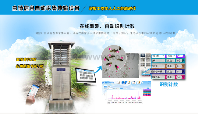 蟲情信息自動采集傳輸設備是新一代圖像識別式蟲情測報工具,在無人監管的情況下,自動完成誘蟲、殺蟲、蟲體分散、拍照、運輸、收集、識別等系統作業,并實時將環境數據和病蟲害數據遠程上傳至智慧農業云平臺,在平臺上實現自動識別計數,對蟲害的發生與發展進行分析和預測,為現代農業提供服務,滿足蟲情測報及標本采集的需求。
